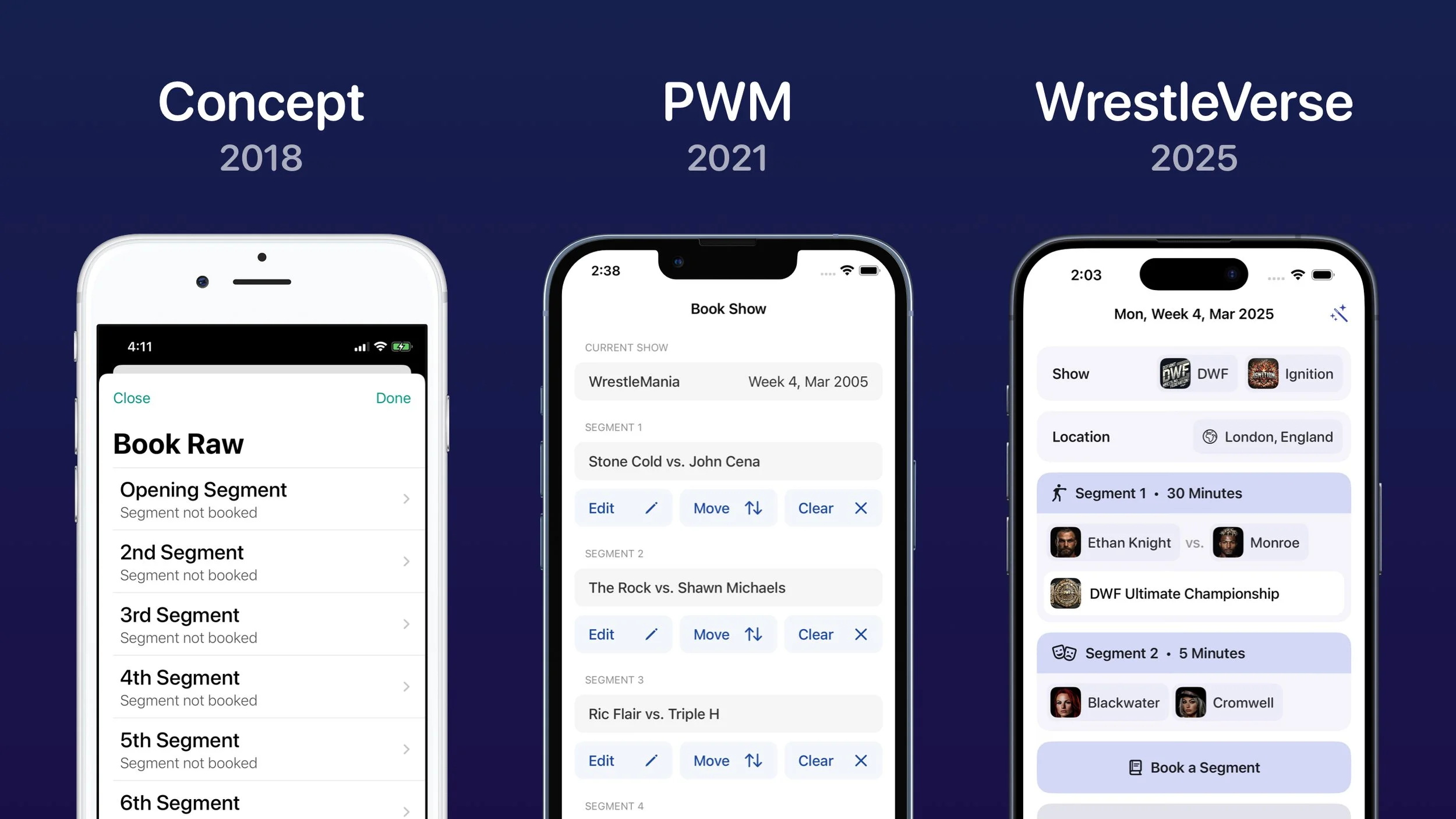 In university I pieced together a proof of concept, something small but just barely playable. That eventually became Pro Wrestling Manager, which evolved into a series of annual releases from 2021 to 2024, with Pro Wrestling Manager 2024 going on to become the highest rated wrestling game in the App Store. Ultimately, it was a test to see if a game like this could actually work on mobile and resonate with people, which it certainly did. But it was a very sandbox game with just your 1 promotion, with no competition, and no real challenge. Just the core mechanics without even any images. While players enjoyed it, I knew it was only the beginning.
